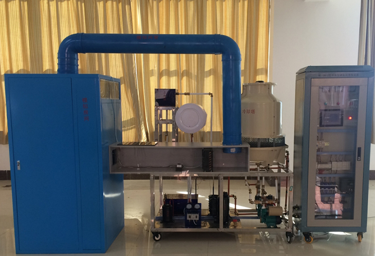設備整體與實(shí)際中央空調系統結構相同,采用開(kāi)放式不銹鋼框架結構,各部件布局合理操作方便。系統由制冷機組、冷卻水系統、冷凍水系統、制熱系統、空氣調節系統(風(fēng)管組件)、模擬房間、電控柜、計算機等部分組成,并配有集水器、分水器、膨脹水箱。