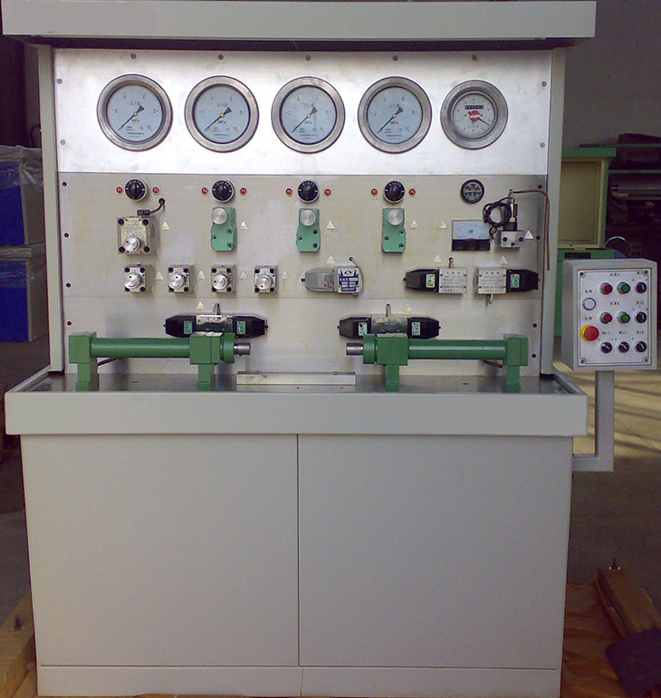 4、設備以機床標準制造,貼近工業(yè)實(shí)際,兩只對頂加載油缸用螺釘固定于鑄鐵臺面上,實(shí)現雙油缸對頂加載,實(shí)驗壓力可到7Mpa,臺面上設集油裝置,避免油液外漏。