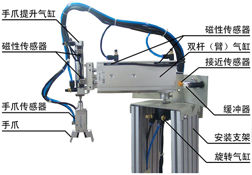 (5)氣動(dòng)機械手裝置:四自由度氣動(dòng)機械手,氣缸及附屬傳感器;氣動(dòng)手臂兩側裝有2個(gè)限位擋板,擋板上裝有電感傳感器、緩沖閥,進(jìn)行對手臂的旋轉限位。整個(gè)搬運機構能完成四個(gè)自由度動(dòng)作,手臂伸縮、手臂旋轉、手爪上下、手爪松緊。