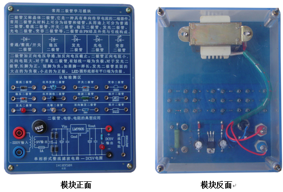 底盒使用190mm×145mm的開(kāi)模有機透明塑料底盒,模塊面板采用印制電路板PCB工藝,可以直觀(guān)看到器件的實(shí)物及相關(guān)的原理介紹。對于典型應用及易損器件安裝在面板背面,透過(guò)透明底盒能夠看到器件實(shí)物,方便感性認識、檢測測試,同時(shí)也能防止器件的損傷。