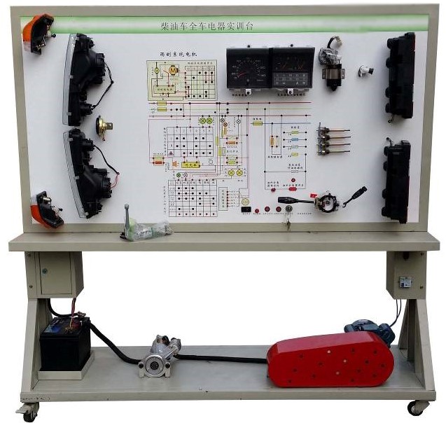 全車(chē)電路板試教板教學(xué)設備采用 全新東風(fēng)牽引車(chē)EQ2102 柴油機整車(chē)電器實(shí)物為基礎,充分展示汽車(chē)儀表系統、燈光系統、雨刮系統、喇叭系統、發(fā)動(dòng)機電器系統、起動(dòng)系統和充電系統等汽車(chē)電器各系統的組成結構和工作過(guò)程。