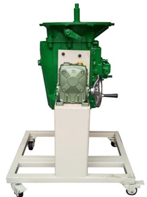 1.采用翻新天錦EQ1120GA2 8JS125TA型手動(dòng)變速器總成(附件齊全,易于拆裝),并裝在專(zhuān)用翻轉架上。 采用減速翻轉機構,可使變速器旋轉任意角度,并能任意位置鎖止,便于學(xué)生從不同的角度進(jìn)行拆卸和裝配。