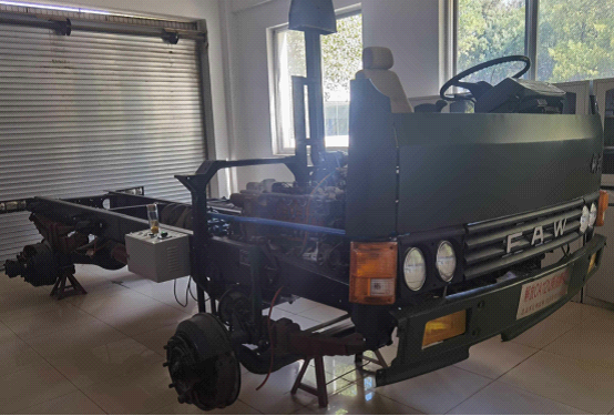 該設備采用東風(fēng)天錦EQ1120GA2型運兵車(chē)底盤(pán)各系統(拆卸車(chē)外殼)為基礎,充分展示汽車(chē)底盤(pán)各系統的組成結構。包括汽車(chē)前后懸掛系、轉向系、傳動(dòng)系、手動(dòng)變速器及掛檔機構、制動(dòng)系等系統、安裝腳輪的可移動(dòng)式臺架等組成。