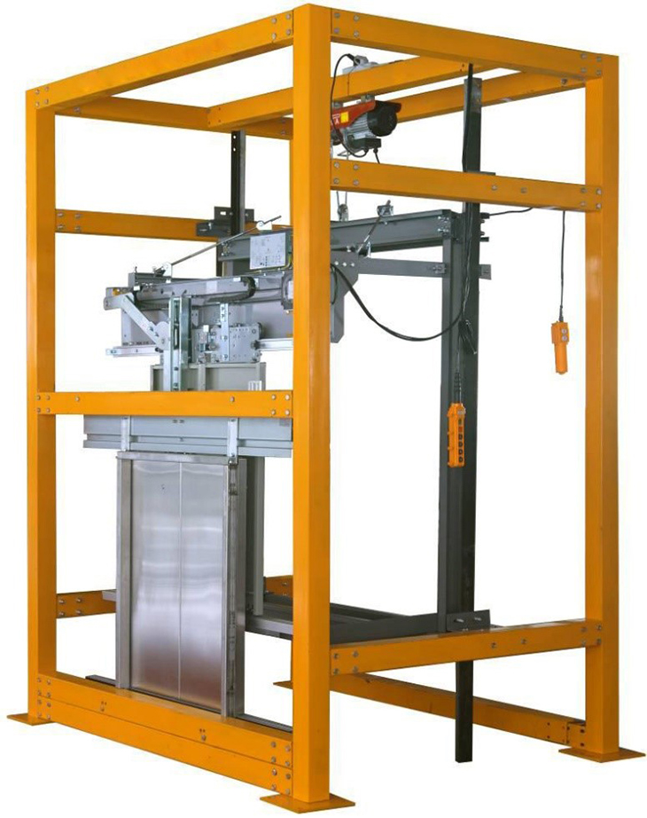 本裝置主要由鋼結構框架、電動(dòng)葫蘆、門(mén)框、層門(mén)門(mén)扇、層門(mén)地坎、層門(mén)上坎、轎廂龍門(mén)架、轎廂門(mén)扇、轎廂門(mén)地坎、門(mén)機、導軌、導軌支架、導靴等部件組成。學(xué)生根據隨機文件資料說(shuō)明,在鋼結構框架內進(jìn)行安裝與調整,使其符合電梯門(mén)系統相關(guān)規范要求。并通過(guò)轎廂架的上下運動(dòng)模擬轎廂在井道中的運行,當平層時(shí),門(mén)機構能夠帶動(dòng)轎廂門(mén)與層門(mén)開(kāi)閉,轎廂離開(kāi)后,層門(mén)緊閉。另外,能夠使學(xué)生直觀(guān)地看到門(mén)機構的全部器件及整個(gè)機械動(dòng)作過(guò)程,更有效地幫助學(xué)生掌握其工作原理。