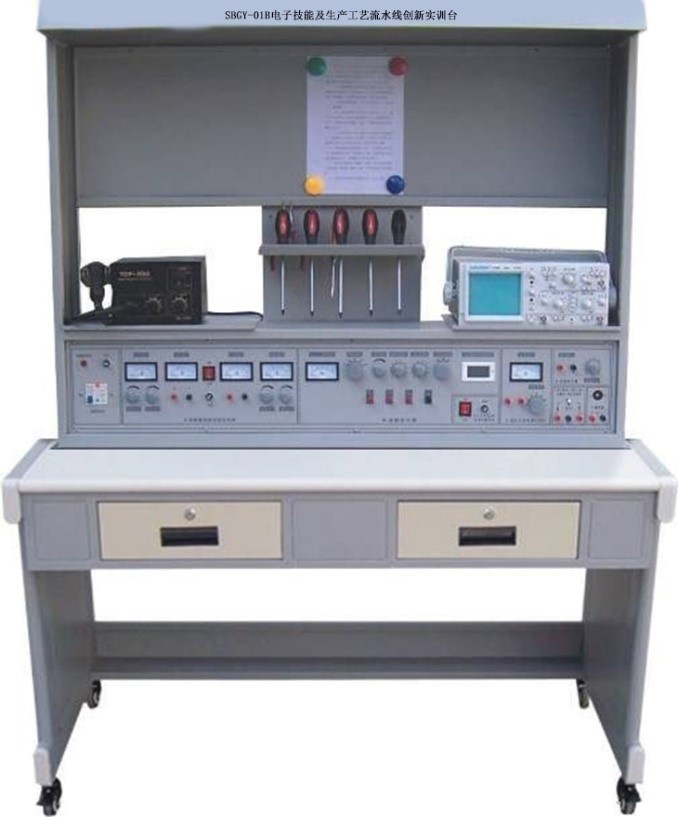 1、電子產(chǎn)品焊接實(shí)訓臺上方裝有照明日光燈1個(gè)、PVC板2個(gè)、三芯雙聯(lián)插座4個(gè)、兩芯插座2個(gè)、中間是看板、儀表臺、插座、工具柜、電烙鐵和元件盒,桌面配一塊絕緣膠皮。