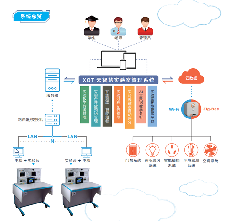 建設在線(xiàn)智慧實(shí)驗室管理系統集成了集成了示波器、信號源、直流電源、萬(wàn)用表儀器,配置平板電腦、攝像頭、音響等多媒體設備,并融合了新興互聯(lián)技術(shù),實(shí)現了實(shí)驗室信息管理、實(shí)驗室智能化管理、遠程互動(dòng)教學(xué)、遠程實(shí)驗管理、遠程儀器管理等功能,為現代化的教學(xué)提供了更廣泛的選擇和更有力的保障。包含學(xué)生、老師、管理員等使用平臺的軟件和與硬件的建設。