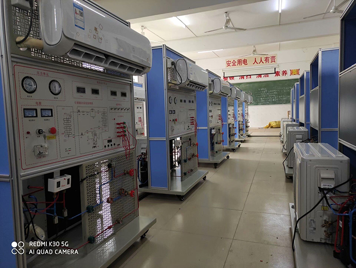 2.、裝置直觀(guān)展示了空調的系統結構和工作原理,便于教學(xué)演示講解及學(xué)生對課本知識的理解掌握。配置的交流電壓表、交流電流表、溫度表、真空壓力表以及相應的信號指示燈,使整個(gè)空調系統的實(shí)時(shí)工作狀態(tài)一目了然;前面板中間印有電氣控制系統原理圖,并設有相應測試點(diǎn)。