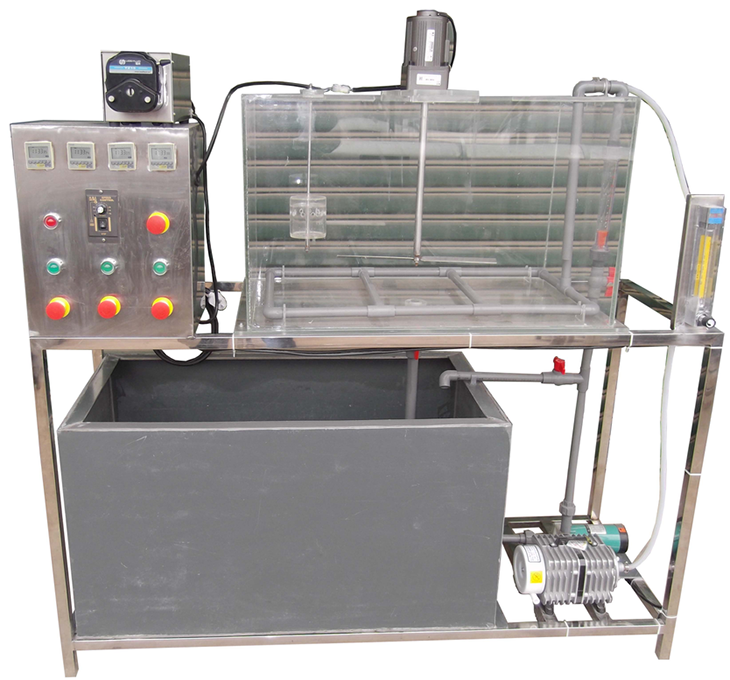 反應池、曝氣頭、抽吸泵、氣泵、水泵、流量計、配水箱、穿孔曝氣器、不銹鋼可移動(dòng)框架、控制屏。