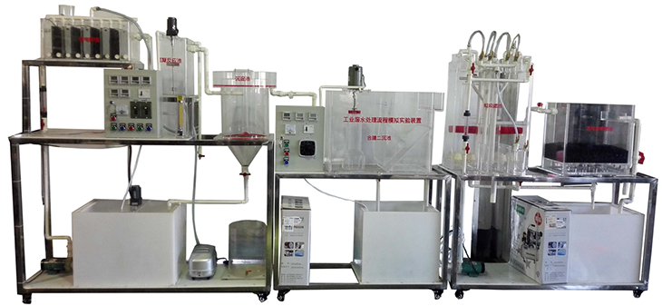 攪拌配水箱、格柵、旋流沉砂池、初沉池、電解槽、絮凝反應斜板沉淀池、小型生化池、中型生化池、好氧生物反應器、二沉池、生化池配水箱、小型進(jìn)水泵、回流泵、充氧泵、直流調節電源、流量計、簾式膜組件、陶瓷曝氣器、調速電機、可控硅無(wú)級調速器、電控箱、時(shí)間控制器、實(shí)驗臺架、管道閥門(mén)。