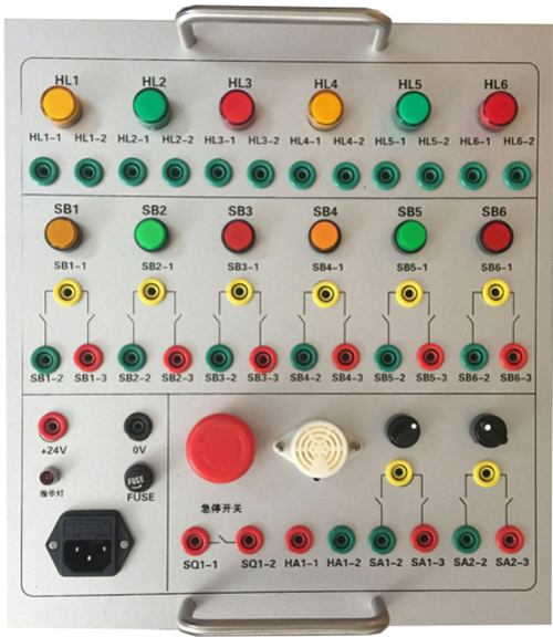 24 V/6 A、12 V/2 A各一組;急停按鈕1只,轉換開(kāi)關(guān)2只,蜂鳴器1只,復位按鈕黃、綠、紅各1只,自鎖按鈕黃、綠、紅各1只,24V指示燈黃、綠、紅各2只; |