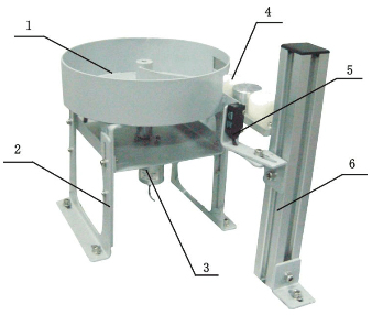 1-轉盤(pán) 2-調節支架 3-直流電機 4-物料 5-出料口傳感器 6-物料檢測支架