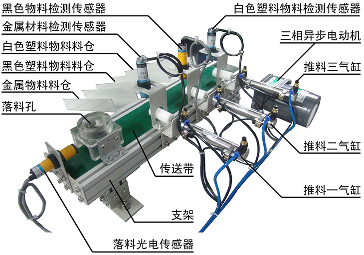 (6)物料分揀裝置:傳送帶通過(guò)三相異步電動(dòng)機驅動(dòng),在傳送帶端點(diǎn)處設計有落料口,通過(guò)光電傳感器檢測物料;傳送帶上裝有三個(gè)出料槽,對應位置有電感傳感器、光纖傳感器等同時(shí)正對料槽位置裝有推料氣缸,共計三個(gè)氣缸。傳送帶采用可拆卸的鋁合金支架。