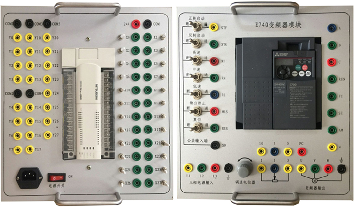 設備的PLC模塊的I/O 端子、變頻器的接線(xiàn)端子、各常用模塊與PLC的連接端子,均與安全插座連接,使用帶安全插頭的導線(xiàn)進(jìn)行電路連接;各指令開(kāi)關(guān)、光電開(kāi)關(guān)、傳感器和指示元件的電路,則通過(guò)端子排進(jìn)行連接。插拔線(xiàn)連接電路與端子排連接電路相結合,既保證學(xué)生基本技能的訓練、形成和鞏固,又保證電路連接的快速、安全和可靠。