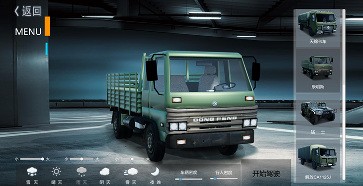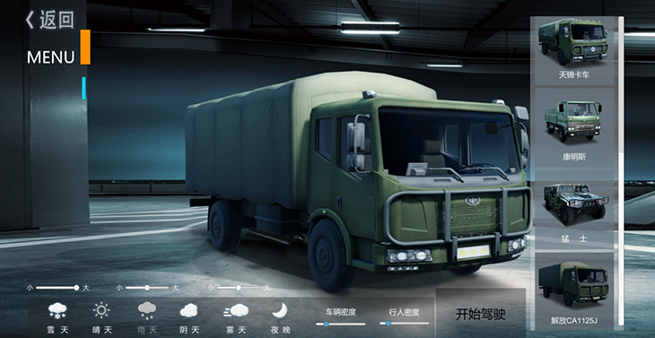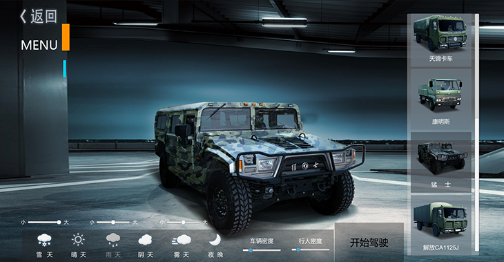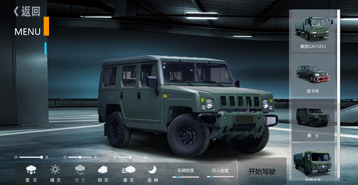 7.1、仿真車(chē)模型:10 種典型虛擬車(chē)輛模型:東風(fēng)猛士、北汽勇士、 EQ1118、EQ1121、 EQ2102、SX2150、SX2190、豪濼 ZZ2197、東風(fēng)天錦、大客車(chē)等,并可根據需要拓展、定制個(gè) 性化車(chē)輛模型。