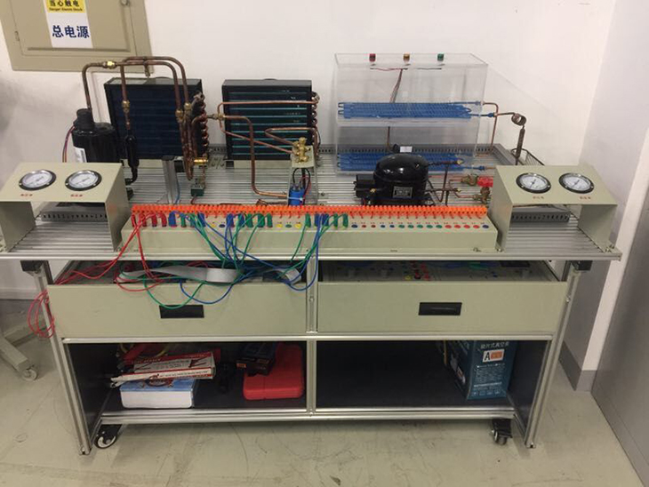 1、實(shí)訓臺采用鋁型材臺架加實(shí)訓模塊結構,裝置采用一體化設計,由導軌式鋁合金安裝平臺、空調系統、電冰箱系統、電氣控制系統等組成。底部安裝有四個(gè)帶剎車(chē)的腳輪,可以方便的移動(dòng)和固定。設備配置空調制冷系統管路1套、直冷電冰箱制冷系統管路1套、安全插端子排,壓力表(1.5MPa)