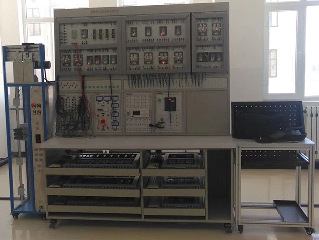 1、模型電梯設4層4站,由模擬井道架、轎廂、對重、曳引機、電梯門(mén)、門(mén)電機、各層站外呼盒及主要安全裝置組成,固定設置在實(shí)驗臺側面。模擬井道架內需配置用于檢測轎廂位置的樓層感應器、平層感應器(與實(shí)際電梯相似)等,其接線(xiàn)端子引至模擬井道架的插接孔上。井道架采用金屬材料為主體支架,有機玻璃封閉!镌O備必須采用臺式結構,設置活動(dòng)式抽屜電氣板,每層抽屜板均設置有公共接線(xiàn)板(總線(xiàn)型接線(xiàn)方式,總線(xiàn)連接點(diǎn)數必須達到120點(diǎn)以上),抽屜電氣板之間采用工業(yè)坦克鏈連接,公共抽屜板連線(xiàn)采用真實(shí)電梯多芯隨行電纜。