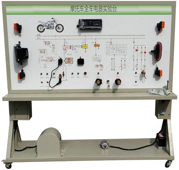摩托車(chē)電器電路實(shí)訓裝置采用全新本田125原車(chē)全車(chē)電器,包括所有燈光、喇叭、儀表、起動(dòng)系統、發(fā)電系統以及相應的設備等,設備整體采用近似原車(chē)的臺式布局,部件均安裝在4mm鋁塑面板上,面板采用UV平板彩色噴繪;各器件之間采用原車(chē)線(xiàn)束進(jìn)行連接,構建原車(chē)真實(shí)的實(shí)訓情景,便于學(xué)生理解和掌握。本裝置可設置典型的原車(chē)電路故障,完成對學(xué)生的技能考核,也可用于職業(yè)技能培訓和鑒定。
