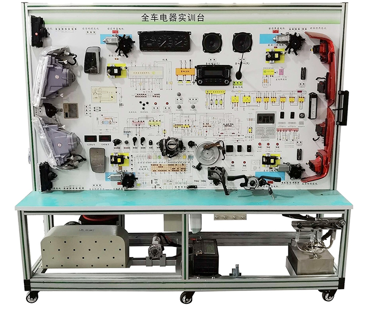 2.設備面板采用耐創(chuàng )擊、耐污染、防火、防潮的高級鋁塑板,表面經(jīng)特殊工藝噴涂底漆處理;面板打印有永不褪色的彩色電路圖;學(xué)員可直觀(guān)對照電路圖和實(shí)物,認識和分析汽車(chē)整車(chē)電器各系統的工作原理。