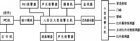 系統主要由一個(gè)六防區的區域性報警系統、大型報警主機及PC機組成。各部分通過(guò)總線(xiàn)和大型報警主機相連;而大型報警主機又通過(guò)通訊接口模塊與PC機相連。