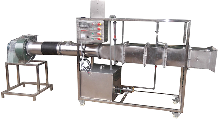 循環(huán)防腐水泵,轉子流量計、風(fēng)冷冷凝器,翅片管式換熱器,風(fēng)洞實(shí)驗段,多翼式低噪音離心風(fēng)機,自動(dòng)調節風(fēng)門(mén),笛形管及差壓測風(fēng)速裝置,加熱由固體調壓模塊無(wú)級調節,控制測試儀表箱,不銹鋼加熱水箱,8路萬(wàn)能信號輸入巡檢儀顯示溫度、水和風(fēng)的阻力及風(fēng)速。