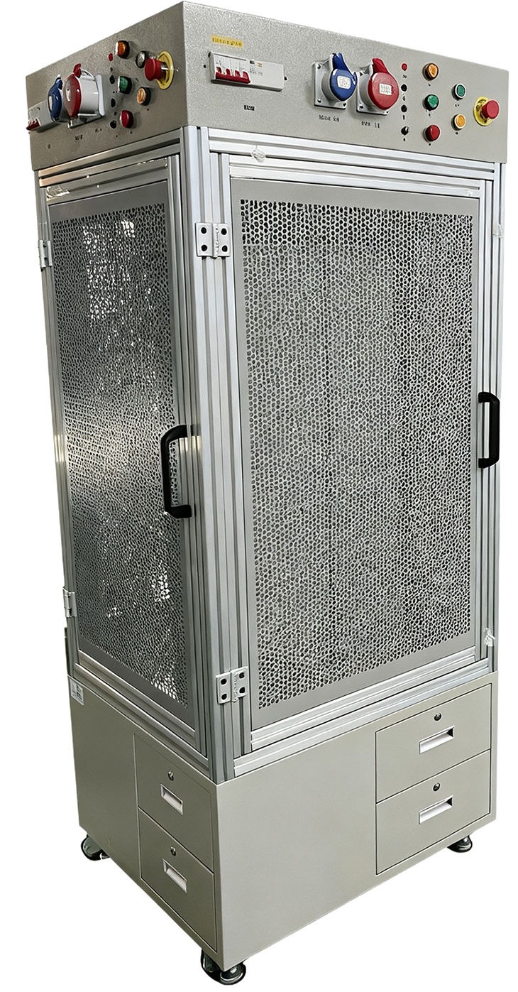 底柜采用≥2mm厚冷軋鋼板折彎焊接制成,表面經(jīng)酸洗磷化后,靜電噴塑完成,整體需美觀(guān)大方,結構輕便,產(chǎn)品耐壓,強度大、抗沖擊不易變形,底部要求配有底腳及轉輪,方便固定及移動(dòng);中間實(shí)訓面由≥1.5mm厚冷軋鋼板折彎、焊接、沖孔后內嵌于實(shí)訓框中,表面靜電噴塑;電氣單元采用≥1.5mm厚冷軋鋼板折彎焊接制成,表面經(jīng)酸洗磷化后,靜電噴塑完成,每個(gè)工位提供:≥1個(gè)斷路器(帶漏電保護模塊);≥1個(gè)歐標380V 16 A插座,≥1個(gè)歐標220V 16 A插座,安全插口 ≥3個(gè)(24V、0V、PE),≥1個(gè)熔斷器(控制線(xiàn)路保護),≥1個(gè)急停開(kāi)關(guān),≥1個(gè)紅色啟動(dòng)指示燈,≥3個(gè)電源指示燈。