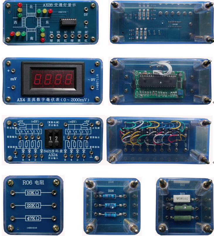 實(shí)訓模塊由透明元件盒及PCB板構成,元件盒是組合式透明元件盒,元件盒單元組采用多元件、典型實(shí)訓單元電路、典型傳感器、通用集成電路插座等制成,可根據實(shí)訓需要方便地組合成不同的電工電子實(shí)訓線(xiàn)路;使實(shí)訓具有開(kāi)放性和創(chuàng )新性,元件盒體由透明有機工程塑料注塑而成,具有示教功能,使使用者能夠觀(guān)察到元件形狀和接線(xiàn)方式,有利于教師講解和學(xué)生認識;面板采用PCB制作而成,表面清爽、符號線(xiàn)路清晰、表面耐磨損、元件更換容易;面板上標志的元件電路符號采用最新國家標準,具有整體結構緊湊、外形美觀(guān)大方、安裝簡(jiǎn)單、使用保管方便等特點(diǎn)。導線(xiàn)插孔采用防轉座,導線(xiàn)裝有彈性插頭可在模塊上面插接,以保證可靠連接進(jìn)行各種實(shí)訓;實(shí)訓時(shí)可根據實(shí)訓內容和技能訓練的需要,方便的任意組合實(shí)訓線(xiàn)路,以完成不同的實(shí)訓項目等。