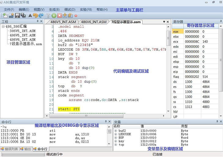 5、 匯編語(yǔ)言支持多段調試;支持寄存器、變量顯示及修改;支持命令行窗口運行DEBUG32調試命令。