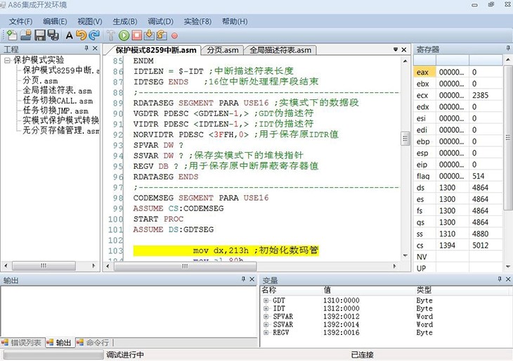 9. A86集成開(kāi)發(fā)環(huán)境調試保護模式匯編程序界面