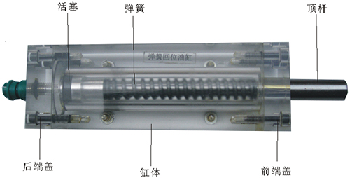 2、雙作用油缸的缸體,端蓋,行程撞塊,撞塊支承等均采用了進(jìn)口透明有機玻璃材料。頂桿采用了45#中碳鋼,并配合油接頭,密封圈,內六角螺絲等標準件精制而成。能通過(guò)它明確地觀(guān)察活塞、頂桿、油封、油孔等結構及其運行過(guò)程。
