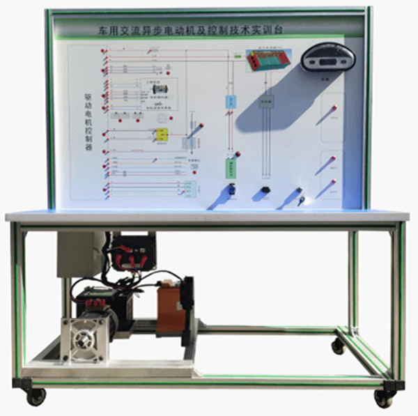 檢測控制面板(裝有各種檢測端子,1448×940mm彩色電路圖和工作原理示意圖)、組合儀表、點(diǎn)火開(kāi)關(guān)、電機控制器、車(chē)載充電器與充電接口、DC-DC轉換器、鋰動(dòng)力電池組、電動(dòng)車(chē)電機(交流異步電動(dòng)機)、剎車(chē)開(kāi)關(guān)、檔位開(kāi)關(guān)、油門(mén)控制裝置、大電流繼電器、電源總開(kāi)關(guān)、急停開(kāi)關(guān)、輔助蓄電池(12V45AH)、一體化全鋁合金型材搭建的移動(dòng)臺架(1500×700×1700mm (帶自鎖腳輪裝置,帶安裝檢測端子的原理面板,面板1448×940mm)、設備操作說(shuō)明書(shū)。