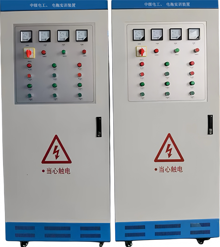 中級電工、電拖實(shí)訓考核裝置按標準電氣控制柜設計制造規格,充分利用雙面位置,柜內裝有完成各種照明電路所需的單相電度表、日光燈、單聯(lián)開(kāi)關(guān)、插座、感應開(kāi)關(guān)、漏電開(kāi)關(guān)等,以及電氣控制所需要的多種低壓電器,如漏電斷路器、熔斷器、電流互感器、交流接觸器、時(shí)間繼電器、熱繼電器、中間繼電器、行程開(kāi)關(guān)、按鈕、信號燈、轉換開(kāi)關(guān)、電壓表、電流表、功率表及電度表等,為了延長(cháng)電器使用壽命,各電器的接點(diǎn)都與接線(xiàn)端子相連,再由接線(xiàn)端子與被控制電氣連接。