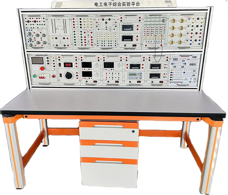 三、電子電工實(shí)訓臺主要配置及功能:電工電子實(shí)驗平臺由實(shí)驗桌、實(shí)驗臺架、存儲柜、實(shí)驗掛箱組件、配件等組成。