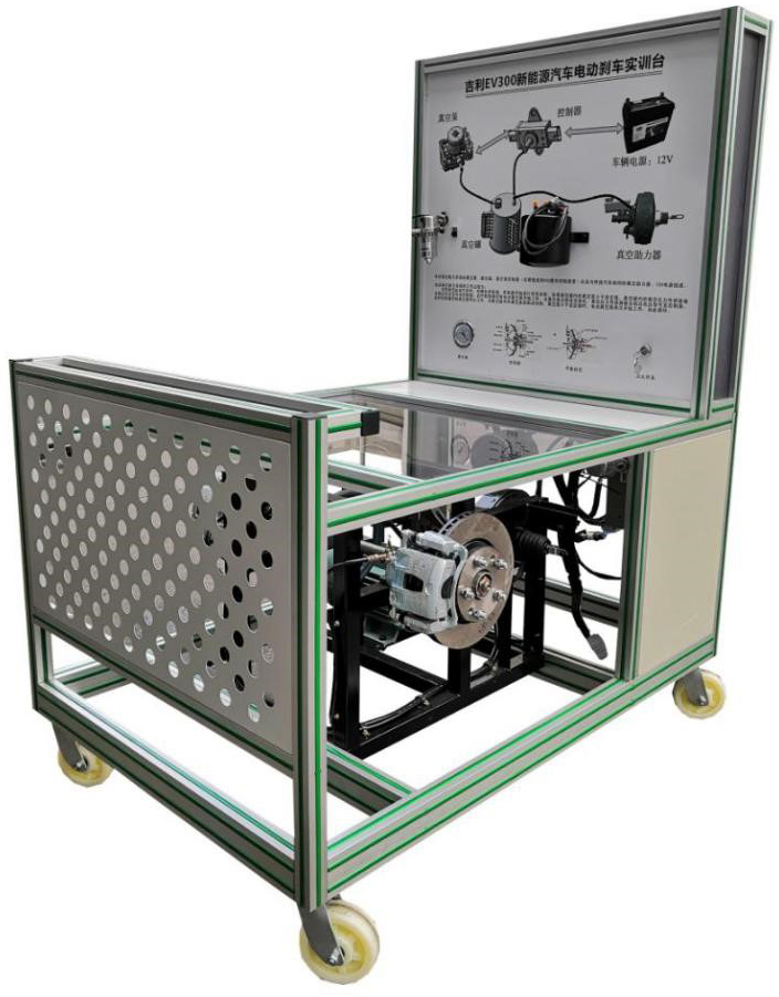 電動(dòng)真空泵(2件,1件解剖)、電動(dòng)真空泵控制單元、真空壓力傳感器、剎車(chē)真空助力器、剎車(chē)總泵與踏板、剎車(chē)真空罐(2件,1件解剖)、剎車(chē)油瓶、開(kāi)關(guān)電源12V30A、點(diǎn)火開(kāi)關(guān)、真空表、壓力表(0~100kg/psi)、左右前輪液壓剎車(chē)盤(pán)總成、左右半軸總成、電機與變頻器(220V4KW1400轉電機,220V5KW變頻器)、電機傳動(dòng)帶與輪盤(pán)一體化全鋁合金型材搭建的移動(dòng)臺架(1500×1000×1700mm ,帶自鎖腳輪裝置,帶安裝檢測端子的原理面板948×898mm)、故障模擬與排除裝置、設備操作說(shuō)明書(shū)。