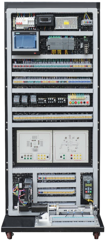 高級維修電工及技師實(shí)訓裝置、工作臺以網(wǎng)孔架為基礎實(shí)訓單元,仿真企業(yè)真實(shí)環(huán)境,可開(kāi)展PLC系統基礎模塊連接實(shí)訓。該工作臺采用單面實(shí)訓方式,實(shí)訓區主要由電源單元、PLC單元、PLC學(xué)習箱單元、基礎實(shí)訓單元、擴展實(shí)訓區(伺服控制小車(chē)運動(dòng)實(shí)訓單元、步進(jìn)電機單元和變頻器單元)六大部分組成。