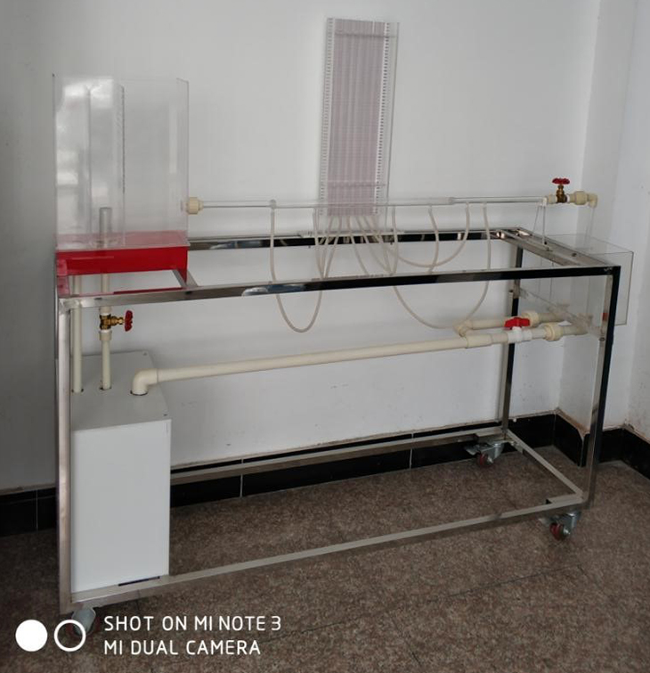 儲水箱、上水管、溢流管、整流柵、溢流板、溢流箱、取壓管、閥門(mén)、測壓板、回水箱、計量箱、回水管;移動(dòng)式不銹鋼實(shí)驗臺;