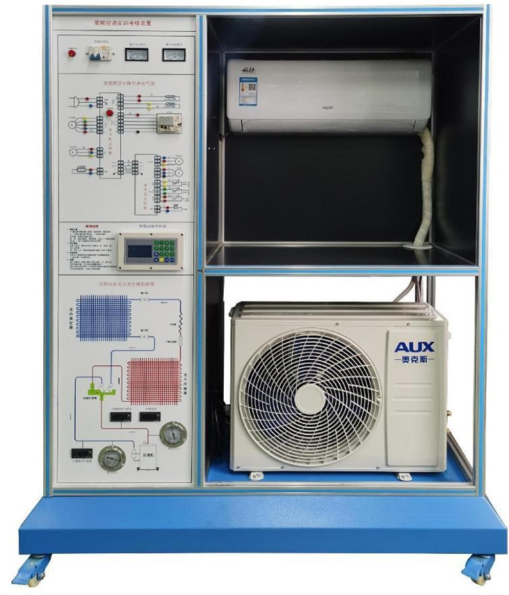 實(shí)訓裝置由控制屏、實(shí)訓桌、空調室外機組、空調室內機組、測量?jì)x表、模擬故障檢測單元、模擬故障箱等組成