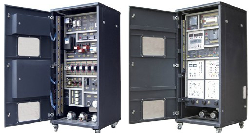 該種維修電工教學(xué)柜式實(shí)訓考核裝置,包括有柜架、觀(guān)察窗、儀表操作盤(pán)、電氣系統、電機機組組成,所說(shuō)的電氣系統由多個(gè)部分前后面板縱向展開(kāi)排列,包括觸摸屏部分、PLC主機部分、變頻器部分、電力電子部分、直流電源部分、電力拖動(dòng)與繼電控制部分,電機軸功率、力矩、轉速測量部分,交直流電壓、電流,單三相交流電能、交流功率、功率因數測量部分等組成。