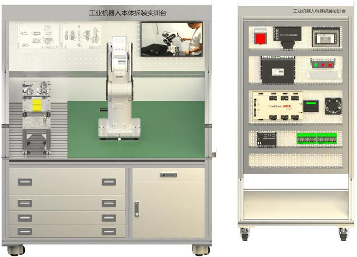 把工業(yè)級的機器人電氣柜的大部件拆散安裝在網(wǎng)孔架上,清晰體現機器人電氣連接原理。