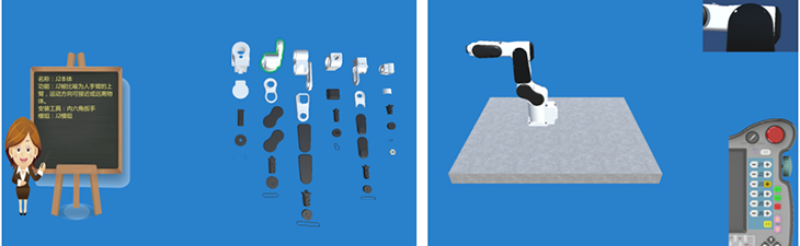 按真實(shí)工業(yè)機器人1:1開(kāi)發(fā)的虛擬仿真拆裝機器人,方便學(xué)生在電腦上反復練習而會(huì )損壞硬件。三維仿真軟件"學(xué)、練、考"對由學(xué)生自主學(xué)習,并自動(dòng)考核。