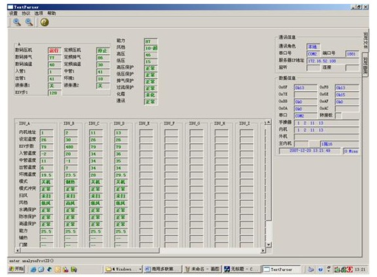 文本顯示界面:可測試壓縮機的運轉頻率,傳感器的各種數據,電子膨脹閥的工作步數等幾十種中央空調的工作數據和狀態(tài),