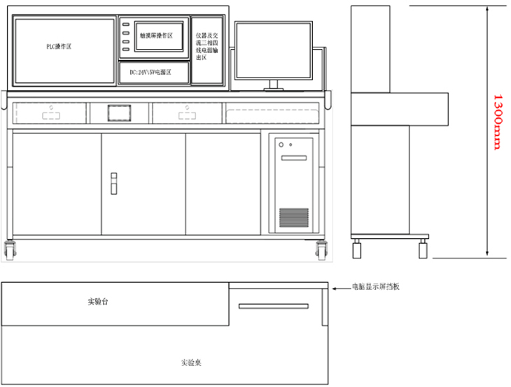 采用鋁木結構實(shí)訓臺,實(shí)訓臺架由實(shí)訓臺、實(shí)訓桌、便攜式模塊、臺式電腦四大部分組成。實(shí)訓臺包括PLC操作區、觸摸屏操作區、直流電源輸出區、交流電源總電源控制保護和交流三相四線(xiàn)電源輸出區;實(shí)訓桌以經(jīng)氧化處理的高材質(zhì)鈑金作為設備主要框架材料,桌身分上下兩層,上層由三個(gè)活動(dòng)抽屜和一個(gè)鍵盤(pán)托板組成,下層左側為推拉式儲物柜,可存放工具材料、元器件等,右側部分空間可用于放置電腦主機。