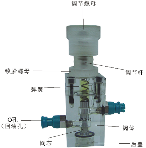 2、溢流閥結構上參考了國產(chǎn)P-63B型低壓直動(dòng)式溢流閥,其閥體閥蓋、鎖緊螺母、調節螺母、螺塞等采用了進(jìn)口透明有機玻璃材料精制而成,閥芯、調節桿采用了45#中碳鋼材料。并配合彈簧,油接頭,密封圈等標準件裝配而成,通過(guò)它可明確地觀(guān)察到閥芯、彈簧、油孔等結構及其運行過(guò)程,具有形象逼真,性能可靠等優(yōu)點(diǎn)。它即可作為教學(xué)模型,也可以作為液壓實(shí)驗元件進(jìn)行實(shí)驗演示。