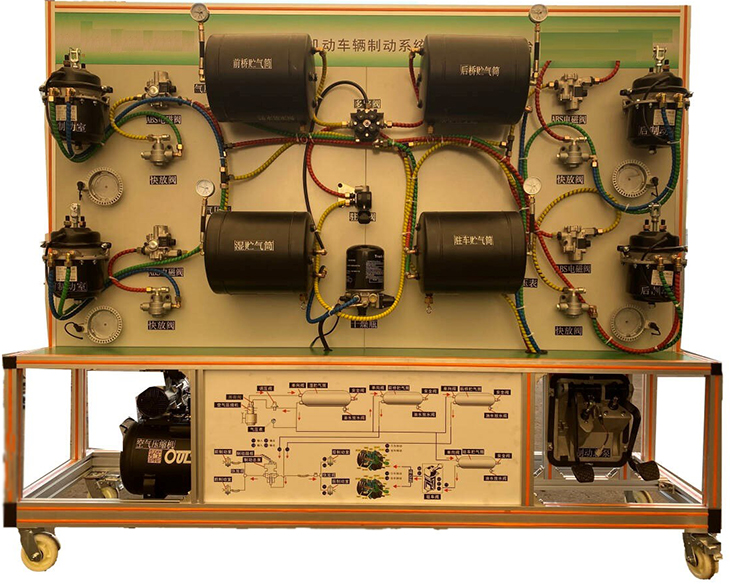 中型高機動(dòng)車(chē)輛制動(dòng)系統結構原理展示臺采用CTM134制動(dòng)系統新品配件和移動(dòng)支架制作而成。其中包含儲氣筒(有儲氣筒的接口)、制動(dòng)踏板、各閥件總成、管路和制動(dòng)氣室等零部件按照原車(chē)氣路進(jìn)行連接,接入氣源后可實(shí)現行車(chē)制動(dòng)和駐車(chē)制動(dòng) 2 種模式的制動(dòng)效果。