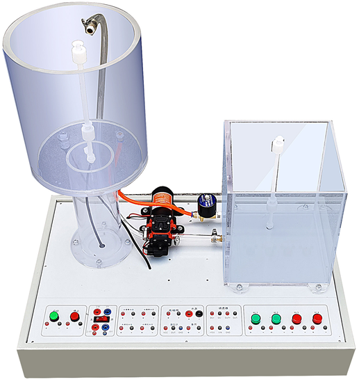 "水塔水位自動(dòng)控制模型"作為PLC控制系統的一個(gè)物理模型,是由有機玻璃水箱、微型水泵、儲水槽、手動(dòng)閥門(mén)、液位傳感器和電氣控制箱組成。
