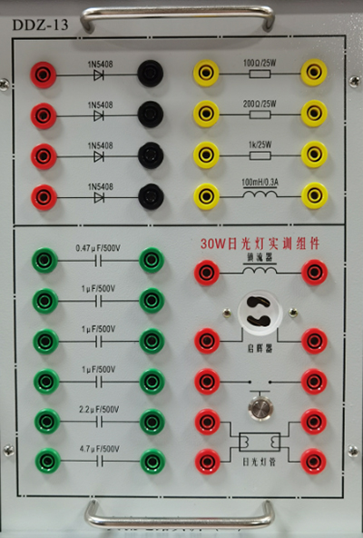 提供0.22uF/500V、0.47uF/500V、1uF/500V(三只)、2.2uF/500V、4.7uF/500V高壓電容、鎮流器、啟輝器、日光燈等,高壓電容可通過(guò)鈕子開(kāi)關(guān)控制,完成日光燈電路連接和功率因數提高實(shí)驗。