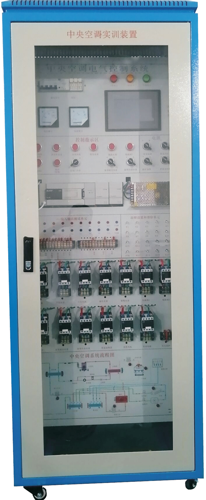 鐵質(zhì)雙層亞光密紋噴塑結構,結構堅固。前門(mén)采用透明設計,可觀(guān)察到中央控制器、接觸器、熱保護器等控制元件。面板上面有控制開(kāi)關(guān)旋鈕、工作狀態(tài)指示燈、系統流程圖及PLC主機單元及測試點(diǎn)。