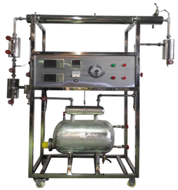 電蒸汽鍋爐、套管換熱器、蒸汽冷凝罐、蒸汽及水流量測試設備、加熱由固態(tài)調壓模塊無(wú)極調節,由多路巡檢儀顯示的溫度測試系統,不銹鋼臺架及控制屏等。