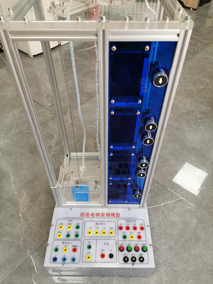 微型四層電梯模型,基本具備實(shí)際電梯的所有功能。具有轎廂的升降和轎廂門(mén)的開(kāi)與關(guān)功能的拖動(dòng)系統,可采集現場(chǎng)的各種信號,如內選按鈕信號、外選按鈕信號、平層、限位信號、廂門(mén)限位信號,實(shí)現各種方式下電梯運行的邏輯控制功能?勺鳛PLC、單片機的被控對象使用。具有性能可靠、運行平穩、操作簡(jiǎn)單、能耗低和便于實(shí)訓教學(xué)。