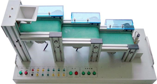 模型主要由漏斗上料裝置、三級傳送帶、直流電機、電磁鐵、電容傳感器、開(kāi)關(guān)、指示燈、鋁型材框架、安裝底板、手柄等組成,通過(guò)PLC編程,可完成自動(dòng)送料裝車(chē)系統的模擬控制。