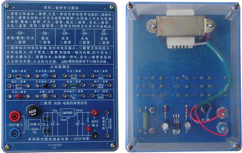 底盒使用190mm×145mm的開(kāi)模有機透明塑料底盒,模塊面板采用印制電路板PCB工藝,可以直觀(guān)看到器件的實(shí)物及相關(guān)的原理介紹。對于典型應用及易損器件安裝在面板背面,透過(guò)透明底盒能夠看到器件實(shí)物,方便感性認識、檢測測試,同時(shí)也能防止器件的損傷。